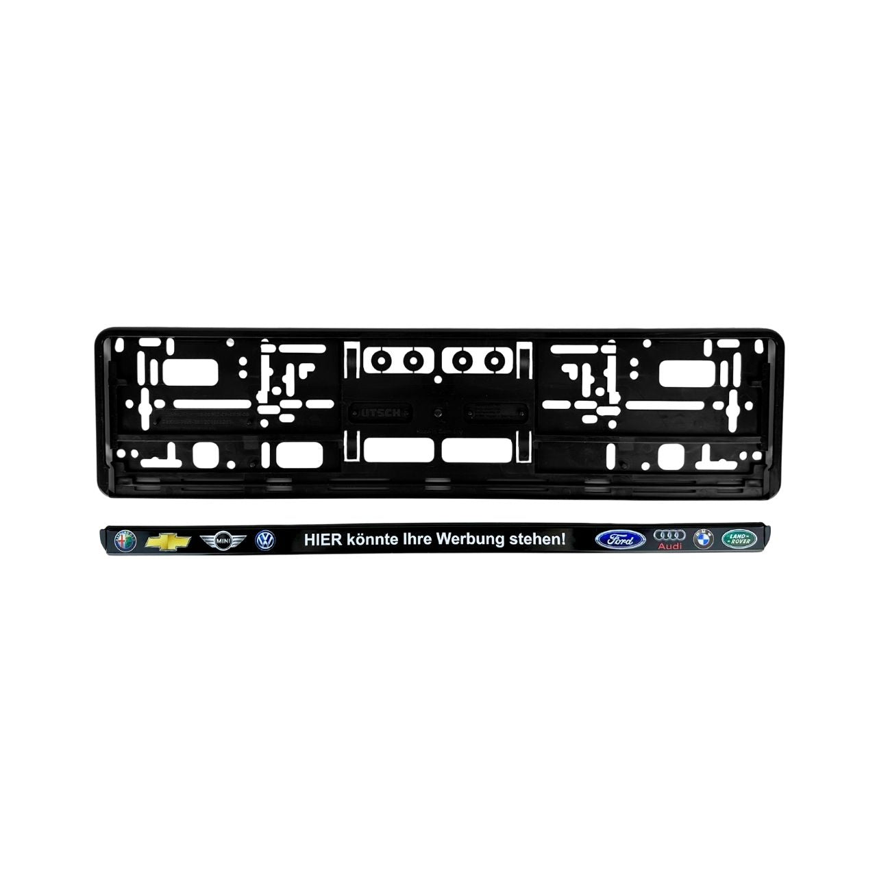 • Zweiteiliger Kennzeichenrahmen (Grundplatte & Leiste)